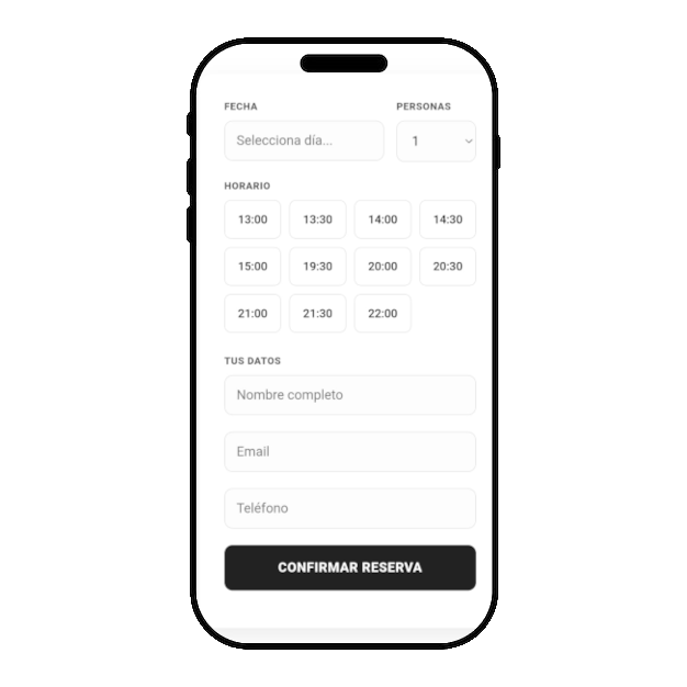 Sin contraseñas. Sin registros obligatorios. Tus clientes eligen hora, ponen su nombre y listo. Menos pasos = Más reservas.