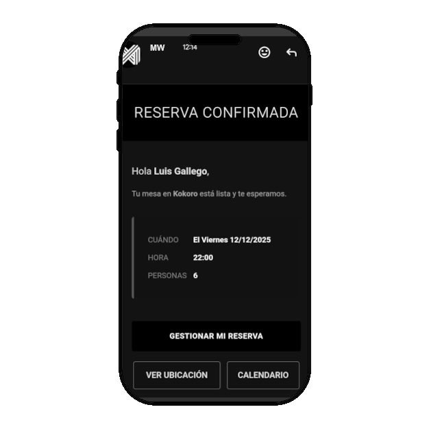 Confirmaciones inmediatas por email con opciones de auto-cancelación. Si el cliente cambia de plan, tu mesa se libera sola.