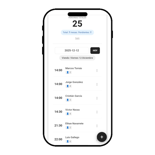Un panel diseñado para empleados. Llama a quien llega tarde con un clic, gestiona, crea o atiende reservas en segundos.